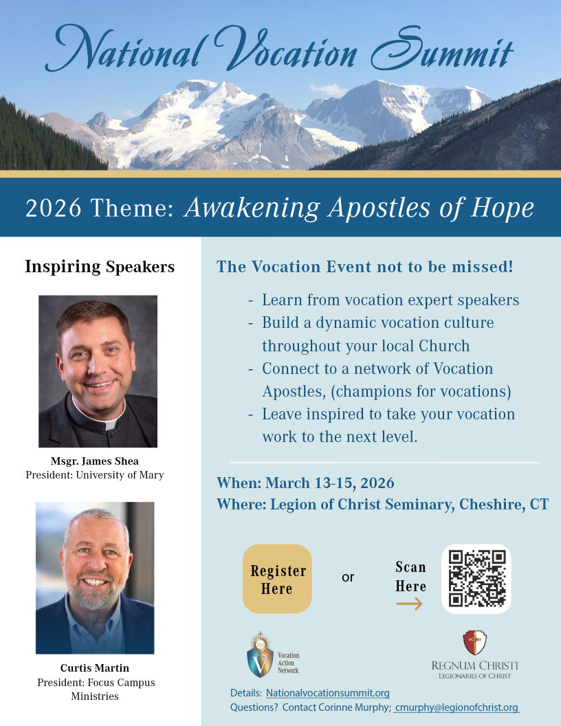 Join religious, diocesan and lay vocation leaders for the 2026 National Vocation Summit, Friday, March 13 through Sunday March 15, 2026. The Theme this year is "Awakening Apostles of Hope". The Summit provides a unique opportunity to collaborate with leaders from every state of life, learn from dynamic speakers, hear personal vocation stories and participate in workshops focused on formation, strategic planning and vocation team building. Topics include Discernment, Building your Vocation Team and becoming a Vocation Apostle. Register today at : NationalVocationSummit.org